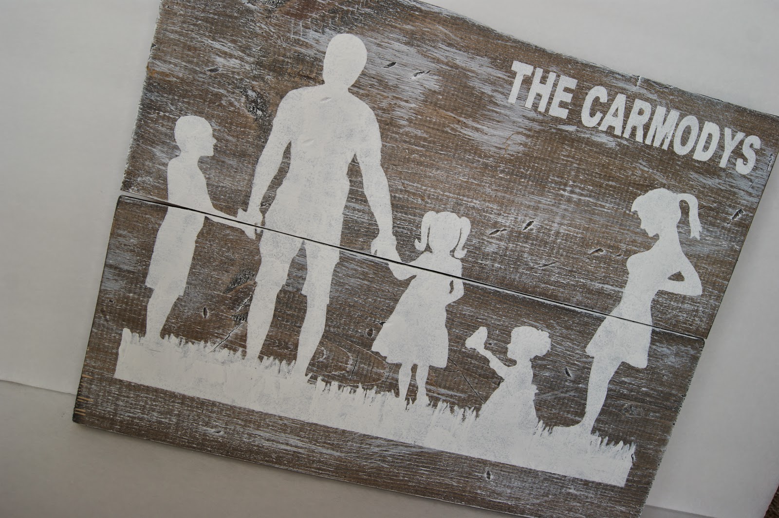 I've always loved anything personalized! A while back I had ordered some note cards with our family silhouette. All of a sudden it hit me, how cute would that be on a pallet sign? Luckily my Silhouette software program had all of the images I needed. Like always, I used my Silhouette to cut the image out and used it as a stencil. I love the way it turned out, and I have some new personalized wall decor!!